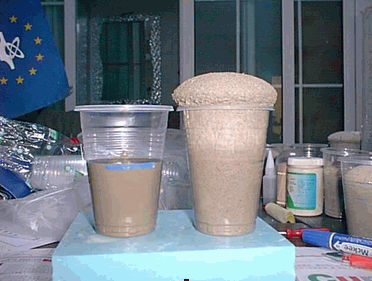 称取水泥100克,发泡剂15克,倒入塑料水杯中,用木棍拌匀后再倒入约50克水,快速搅拌成稀浆(可流成线状),并将浆体初始高度画好标记。约10~20分钟(与气温高低有关)后,水泥浆体将自动发泡,约半小时后发泡体基本稳定,可直观其发泡效果,并可测验出发泡倍率。(参见下图)